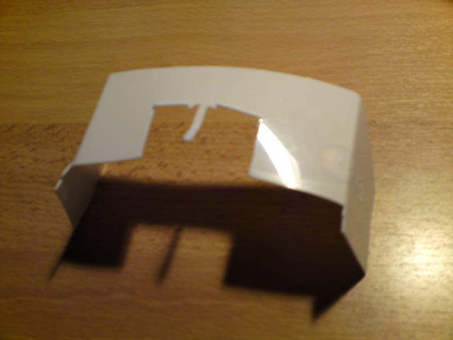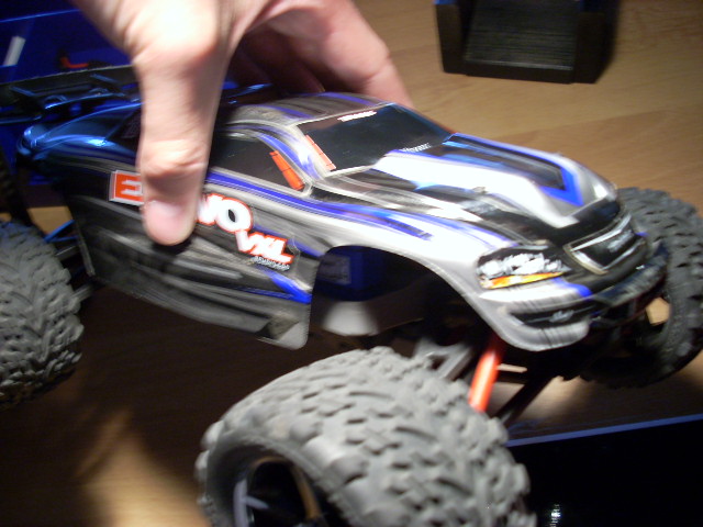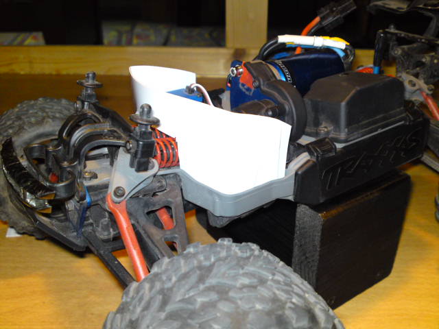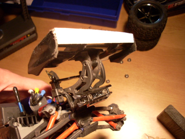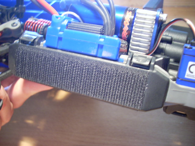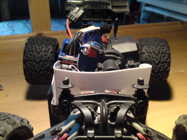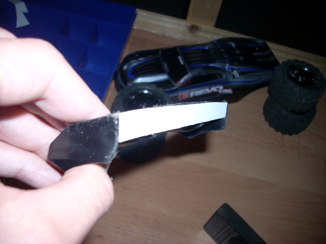 Das Material ist ca. 1 mm dicker Kunststoff, der entsprechend der Form des Revos zugeschnitten wurde und mit kleinen Plastikstücken im Chassis verkeilt wird.