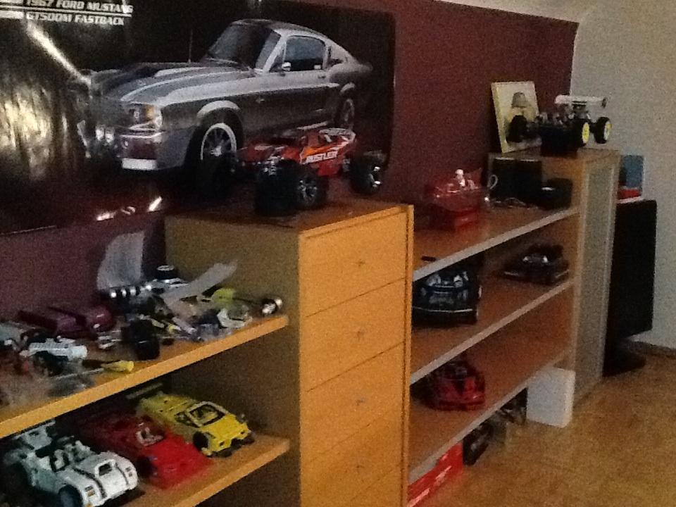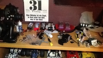Eine in meinem Zimmer für kleinere Arbeiten und meine Akkusammlung (u.a 2x 3s Hacker Lipos für meine neuste anschaffung, mehr dazu ein anderesmal) dann noch meine Ladegeräteecke ( es muss schnell gehen damit ich schnell wieder