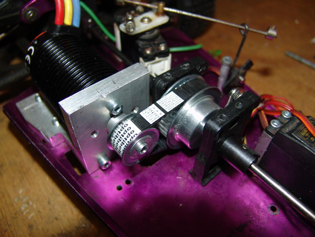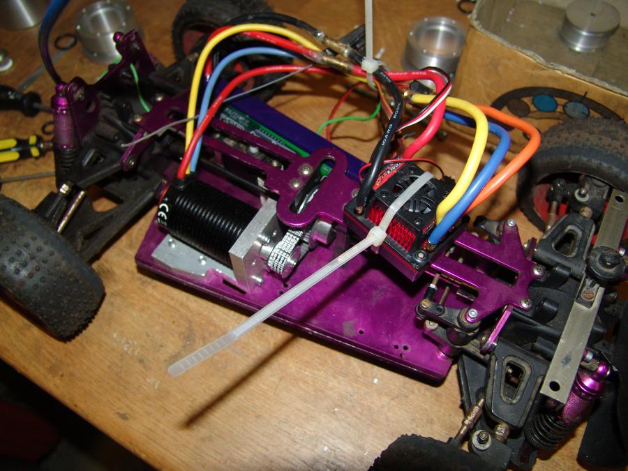 Um mal eine Proberunde zu fahren gabs dann erstmal massig Kabelbinder. Dabei ist mir dann aufgefallen, das ich mir mal einen neuen Lenkservo suchen müsste. Der Jetzige kommt mit der Motorisierung überhaupt nicht klar.. Der Riemen müsste noch ein wenig gespannt werden. Denke mal ich werd ein Lager drauf drücken lassen um ein wenig mehr Spannung drauf zu bekommen. Das Ritzel auf der Motorwelle wollte ich noch gegen lagern um etwas Last von der Welle und von den Motorlagern zu nehmen.
