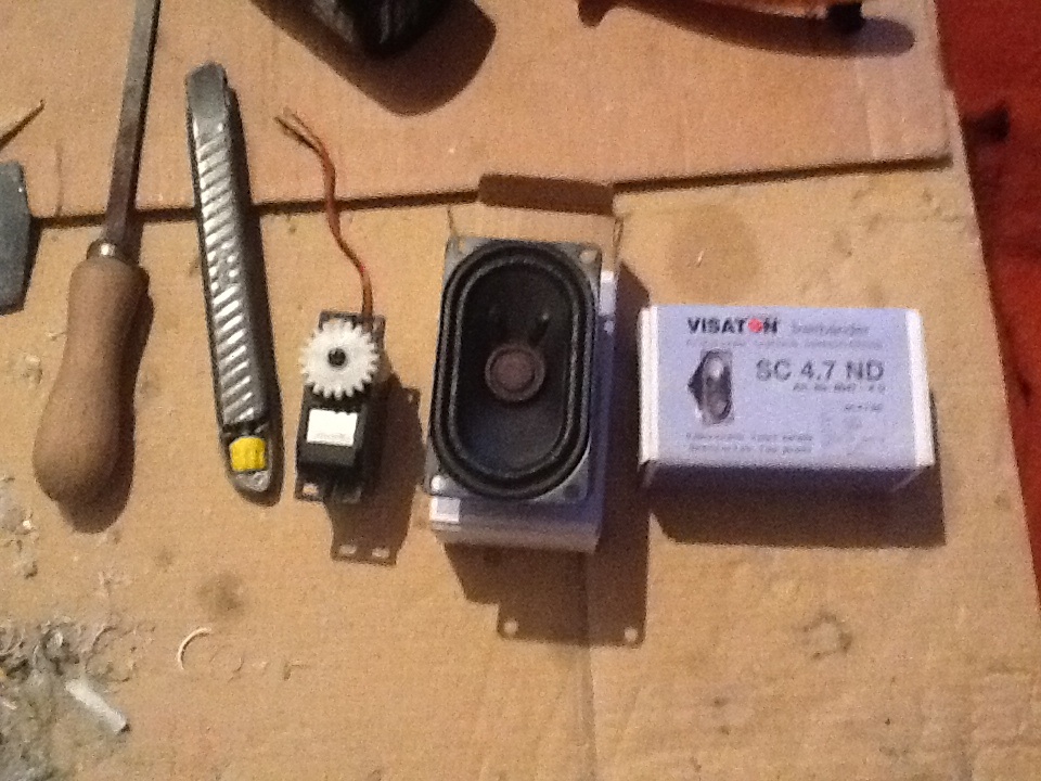 Nun zu dem Platzproblem. Ich würde das Servo an die Seite setzen, dann hast Du Platz für die Lautsprecher. Die befestigung für´s Servo bekommst Du doch auch noch hin, oder? Hast Du bei dem Servo eigendlich die gesammte Steuerungsplatine rausgebaut? Also bekommt der Motor über den Schalter Strom und dreht aber dann nur in eine Richtung, oder wie?