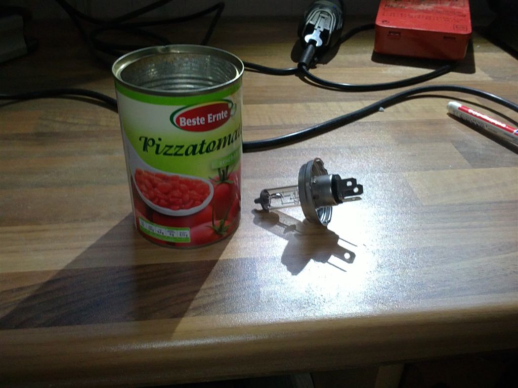 man nehme: eine dose pizza-hacktomaten vom örtlichen discounter, ne alte H4 autolampe