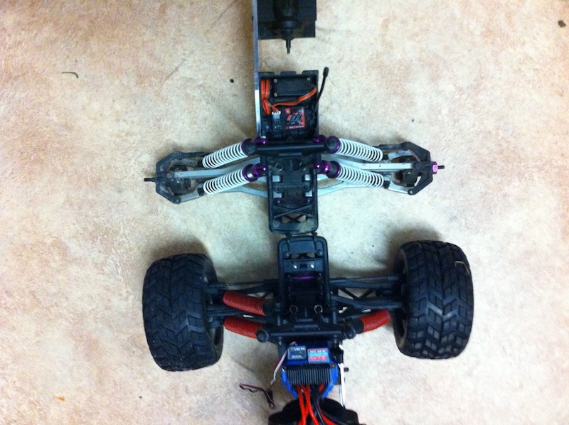 Ich fahre schon seit mehreren jahren einen E-Zilla von Hotbodies (der jetztige HPI E-Savage) und habe so einiges an Erfahrung mit dem Modell gesammelt. Wenn man das Modell original lässt macht es echt spass und es hält auch recht gut, jedoch war es mir nicht genug schnell und ich kaufte mir ein Brushless system von Conrad (so ein billiges schei** Teil) und ab diesen Moment fingen die Probleme an. Die Antriebswellen mussten nach jeder Fahrt getauscht werden und so verging mir der Spass recht schnell. Ich kaufte ein verbreiterungsset inklusive CVD Antriebswellen von dem Hause GCM-Machine. Das Modell gefiel mir aber dann nicht mehr, da er wie ein Würfel aussah. Ich entschloss mich also ihn komplett umzubauen mit einem 1/8 Brushless von Novak und eine verlängerung des Radstandes. Die Chassisplatten habe ich über Mastercam verlängert und über die Firma Schäffer fräsen lassen, da ich zu faul war dies selbst zu machen. Das BL-System habe ich vor einer Woche in dem Onlineshop TowerHobbies bestellt, das in den nächsten Wochen kommen wird. Es handelt sich um das Novak diablo das ich mit zwei Turnigy LiPos betrieben werde.
