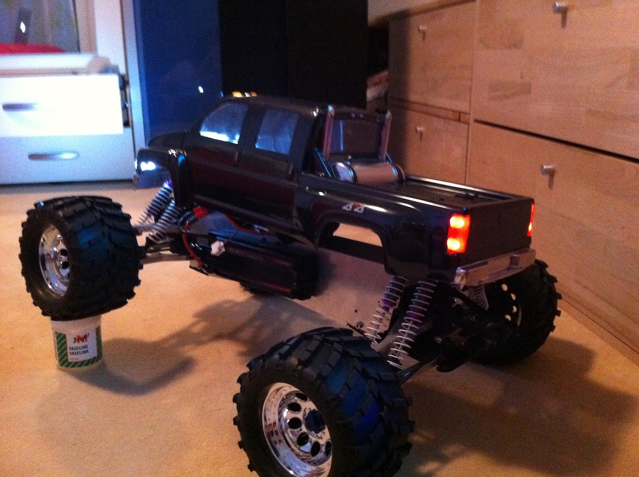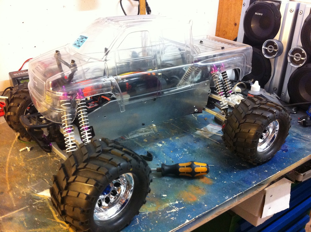 Ich fahre schon seit mehreren jahren einen E-Zilla von Hotbodies (der jetztige HPI E-Savage) und habe so einiges an Erfahrung mit dem Modell gesammelt. Wenn man das Modell original lässt macht es echt spass und es hält auch recht gut, jedoch war es mir nicht genug schnell und ich kaufte mir ein Brushless system von Conrad (so ein billiges schei** Teil) und ab diesen Moment fingen die Probleme an. Die Antriebswellen mussten nach jeder Fahrt getauscht werden und so verging mir der Spass recht schnell. Ich kaufte ein verbreiterungsset inklusive CVD Antriebswellen von dem Hause GCM-Machine. Das Modell gefiel mir aber dann nicht mehr, da er wie ein Würfel aussah. Ich entschloss mich also ihn komplett umzubauen mit einem 1/8 Brushless von Novak und eine verlängerung des Radstandes. Die Chassisplatten habe ich über Mastercam verlängert und über die Firma Schäffer fräsen lassen, da ich zu faul war dies selbst zu machen. Das BL-System habe ich vor einer Woche in dem Onlineshop TowerHobbies bestellt, das in den nächsten Wochen kommen wird. Es handelt sich um das Novak diablo das ich mit zwei Turnigy LiPos betrieben werde.