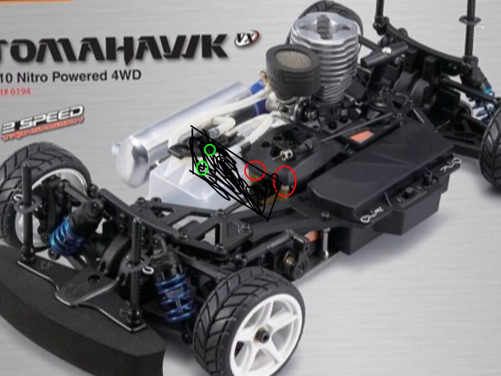 Du könntest da, wo der bremssattel montiert ist (durch rote Kreise gekennzeichnet), eine Carbon-oder aluplatte als Motorhalter montieren und in diese passende Löcher für die Motorschrauben bohren (grüne Kreise).Ich hab das schonmal bei einem 1/8er buggy gesehen und es hält gut wenn die Platte dick und die Schrauben lang genug sind. Bei Brushless Sets und Akkus schau mal bei Hobbyking.com vorbei aber achte darauf, dass du des Zeug von dem Europäischen Warenhaus kaufst denn dann hast du kein gschiss mit zoll etc.