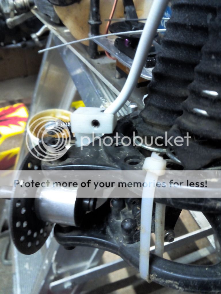 Die Durchführung an der Dämpferbrücke hab ich auch neu angefertigt. Natürlich ebenfalls mit schrägen Bohrungen, welche exakt in Richtung Servo gehen. Auch hier wird der Schlauch fest eingepresst. Madenschrauben waren hier nicht mehr nötig. Hält bombenfest. Nun ist der Bremsdraht optimal geführt: