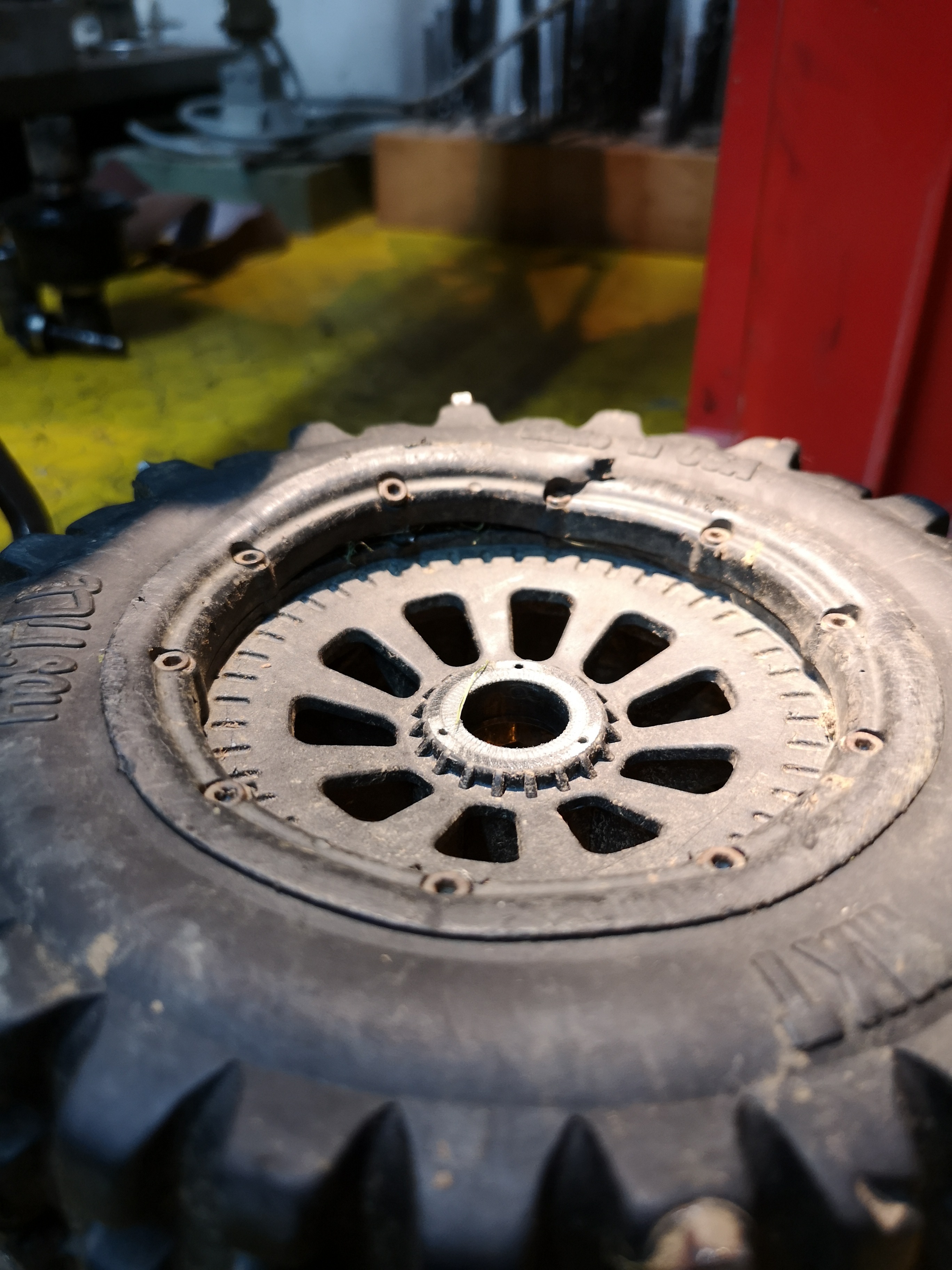 Als letzter SChritt gings daran den verbogenen Beadlock Ring an der vorderen Felge zu reparieren. Unter dem Reifen hatte sich schon nen Büschel Gras gesammelt. Den Ring konnt ich nur noch mit etwas Wärme und nem Seitenschneider richten. DAnn alles wieder brav montiert, Reifen auf den Losi und ab ins Regal mit ihm :D