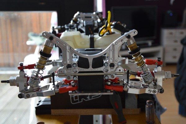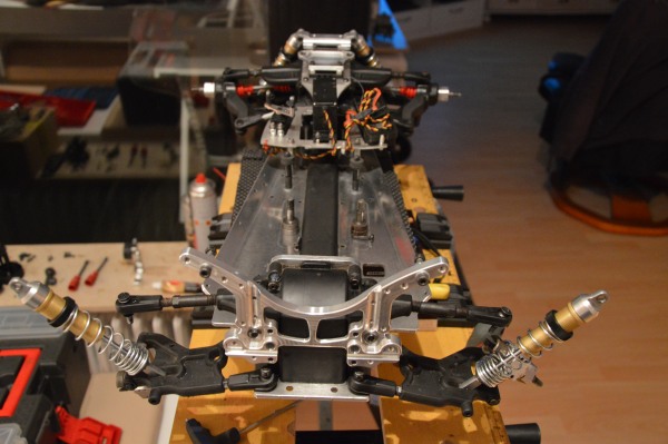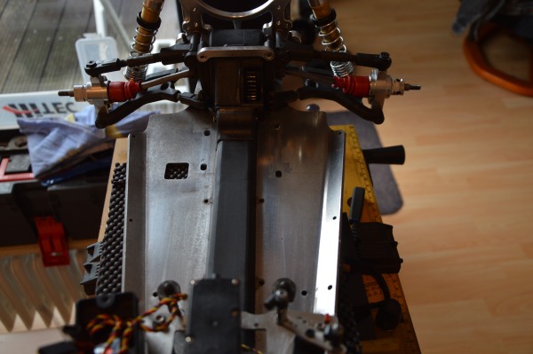 Erstmal soweit alles wieder zusammen und alles verbaut, war auch nichts übrig ausser der ganze Plastikkram. Irgendwie sticht mir die schwarze Vorderachse ja doch immer ins Auge. Eigentlich sollte die so bleiben , evtl Achsschenkel aus Alu aber die Ober und Unterlenker? Bei nem Crash steht man schnell da mit kurzem Hemd