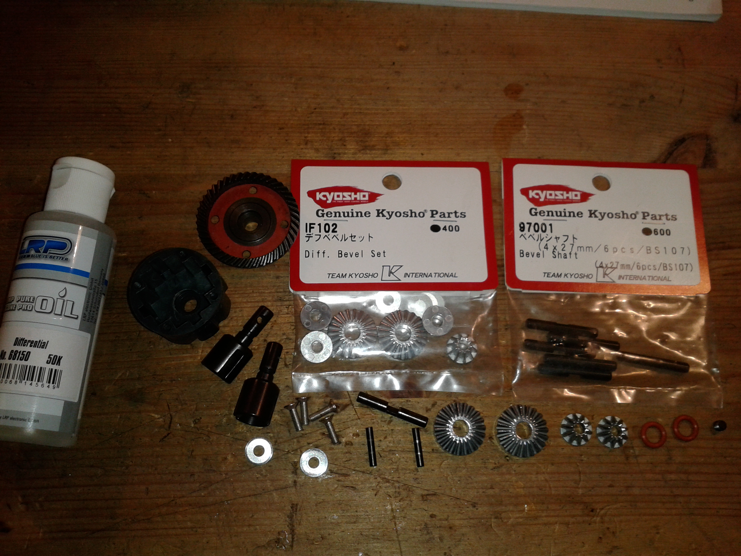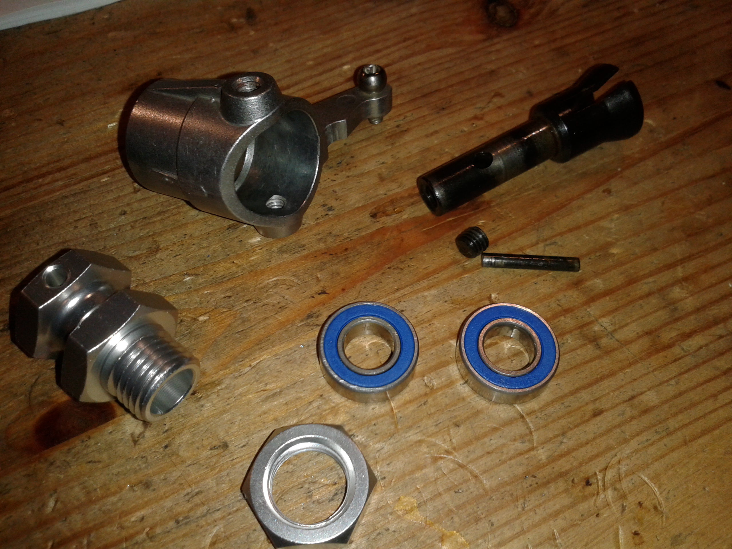 ) und konnte am Abend noch etwas schrauben.Als erstes habe ich mich natürlich um die Diffs gekümmert. Um diese auf 4Spider umzurüsten, braucht man einfach noch eine Welle, zwei Kegelräder und Shimscheiben. Wirklich geshimt sind die Diffs jetzt nicht, ich habe einfach unter jedem Kegelrad eine Scheibe. Läuft aber alles.