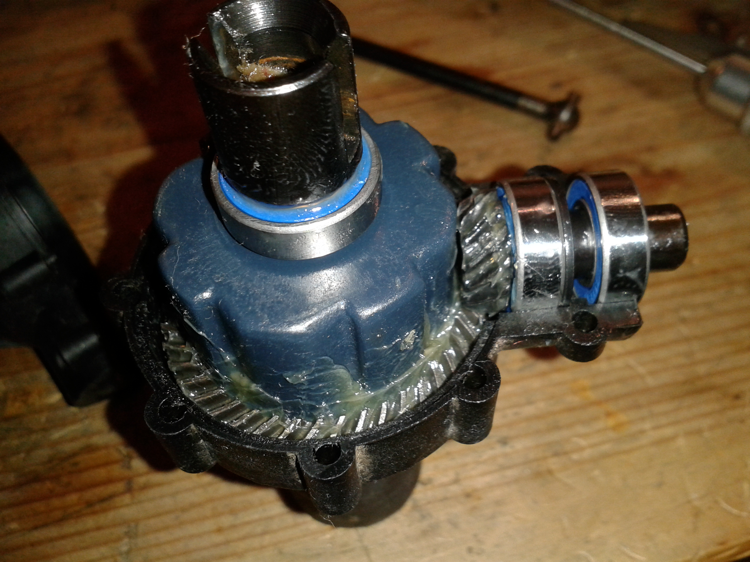 Als nächstes wurden das äußere Kegelrad und das vom Mittelgetriebe kommende ordentlich eingefettet und in die Achse eingebaut. Auf dem Bild sieht das etwas dreckig aus, ist aber eigentlich sauber.