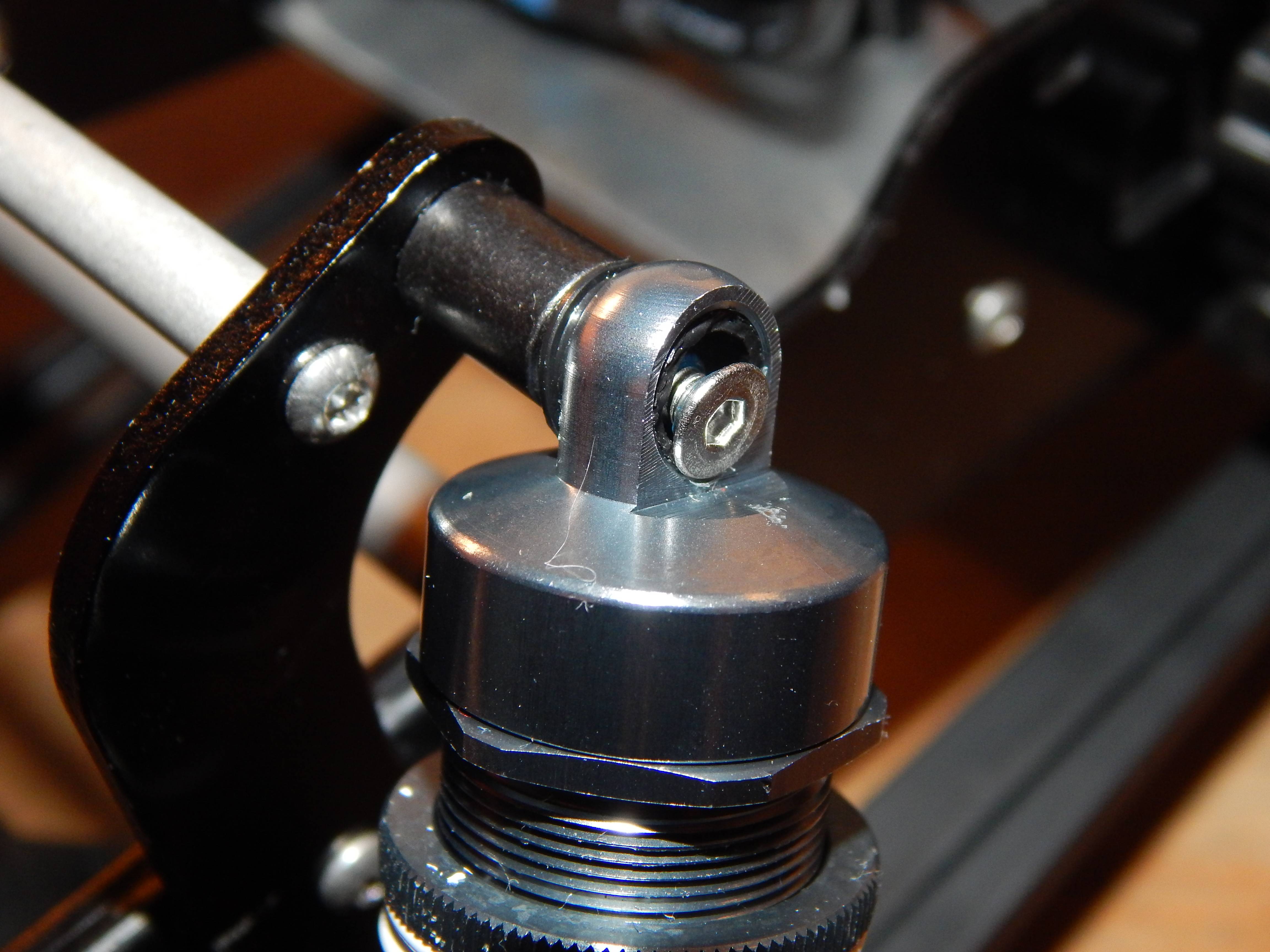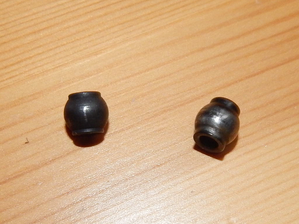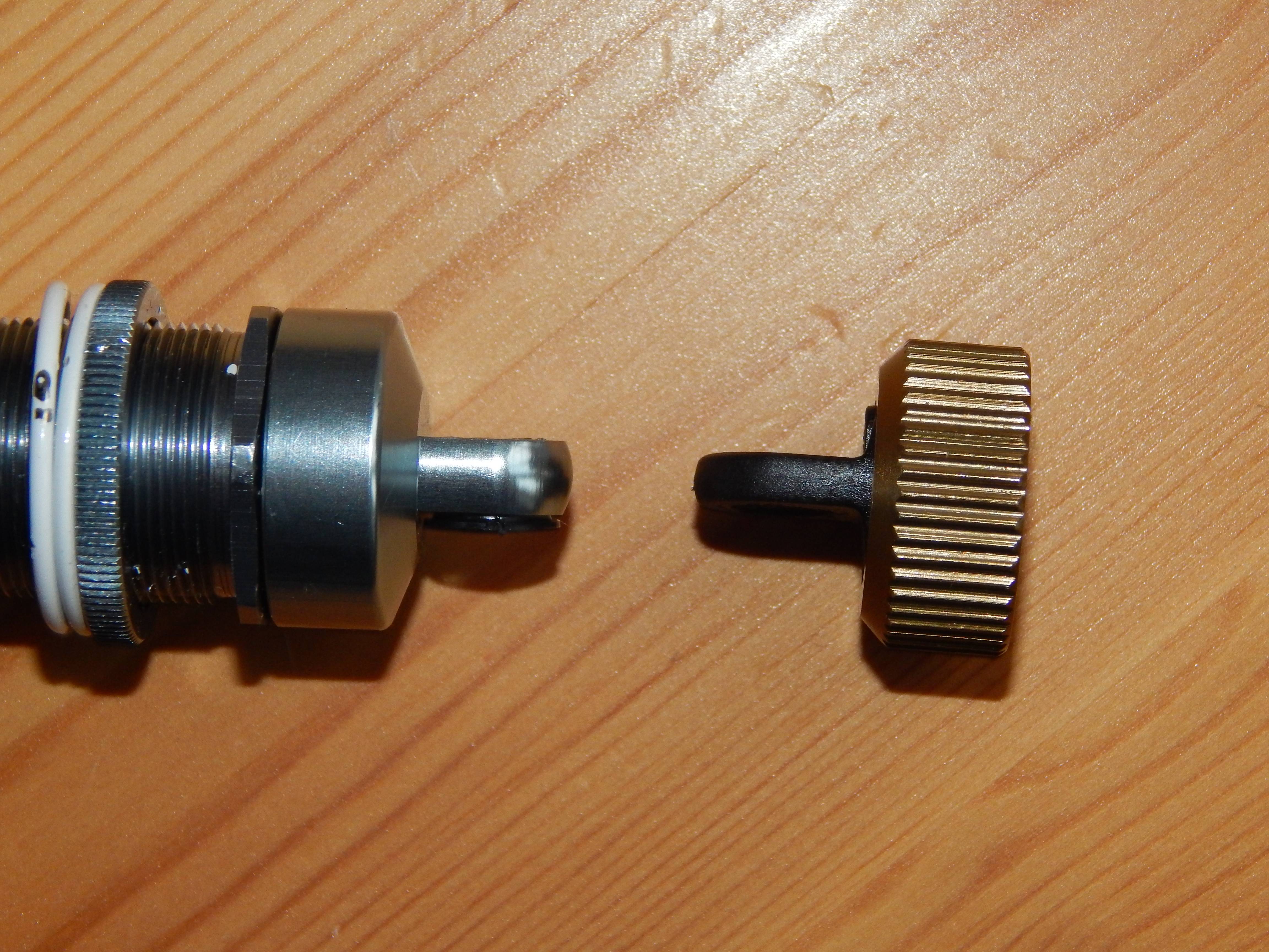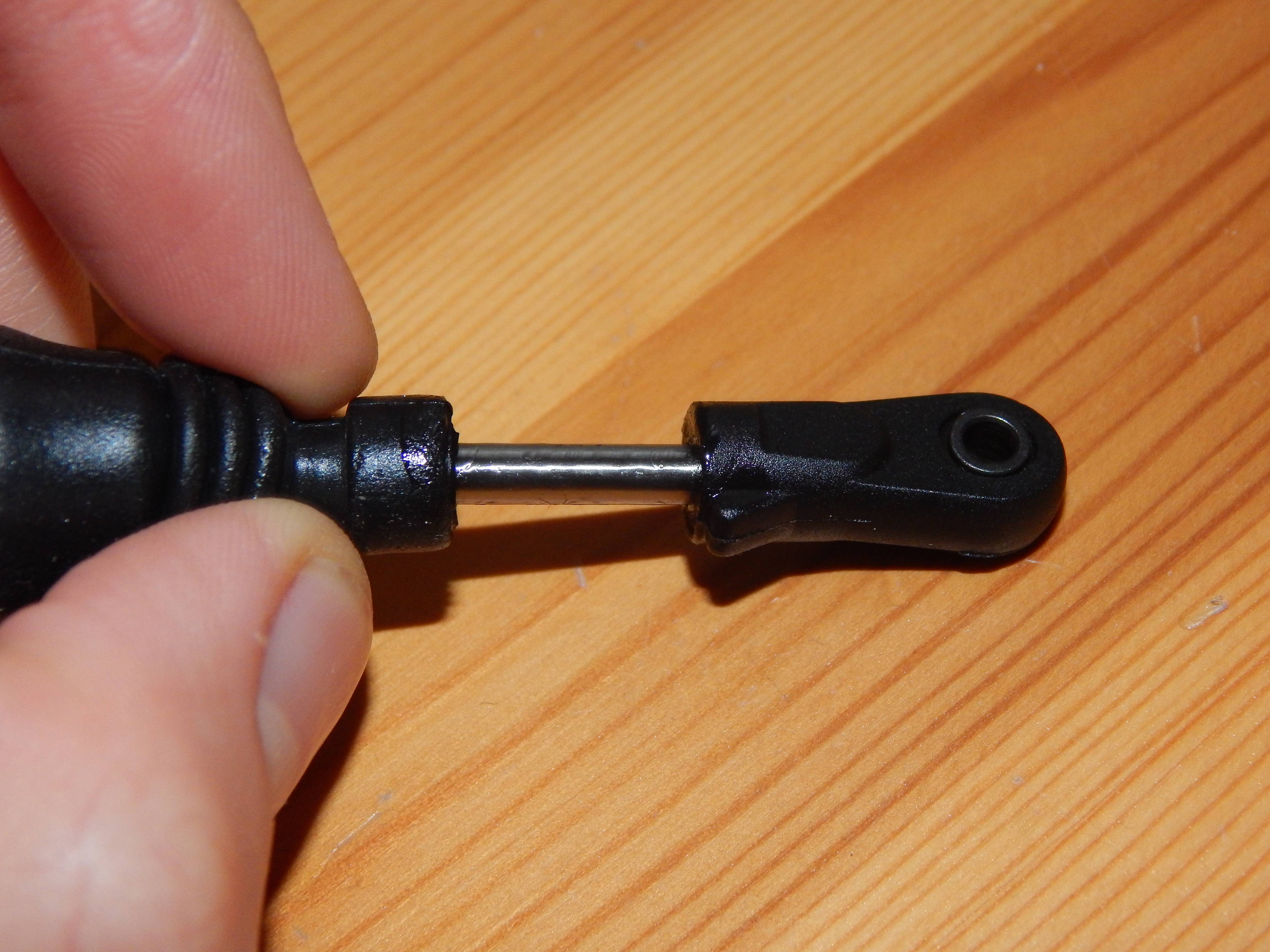 Also habe ich die Aludämpfer so weit es geht auf den oberen Kugelpfosten gesteckt und dann statt einer 4mm langen Senkkopfschraube eine 10mm lange genommen. Da ich sie nicht komplett reindrehen kann, habe ich Loctite genommen.