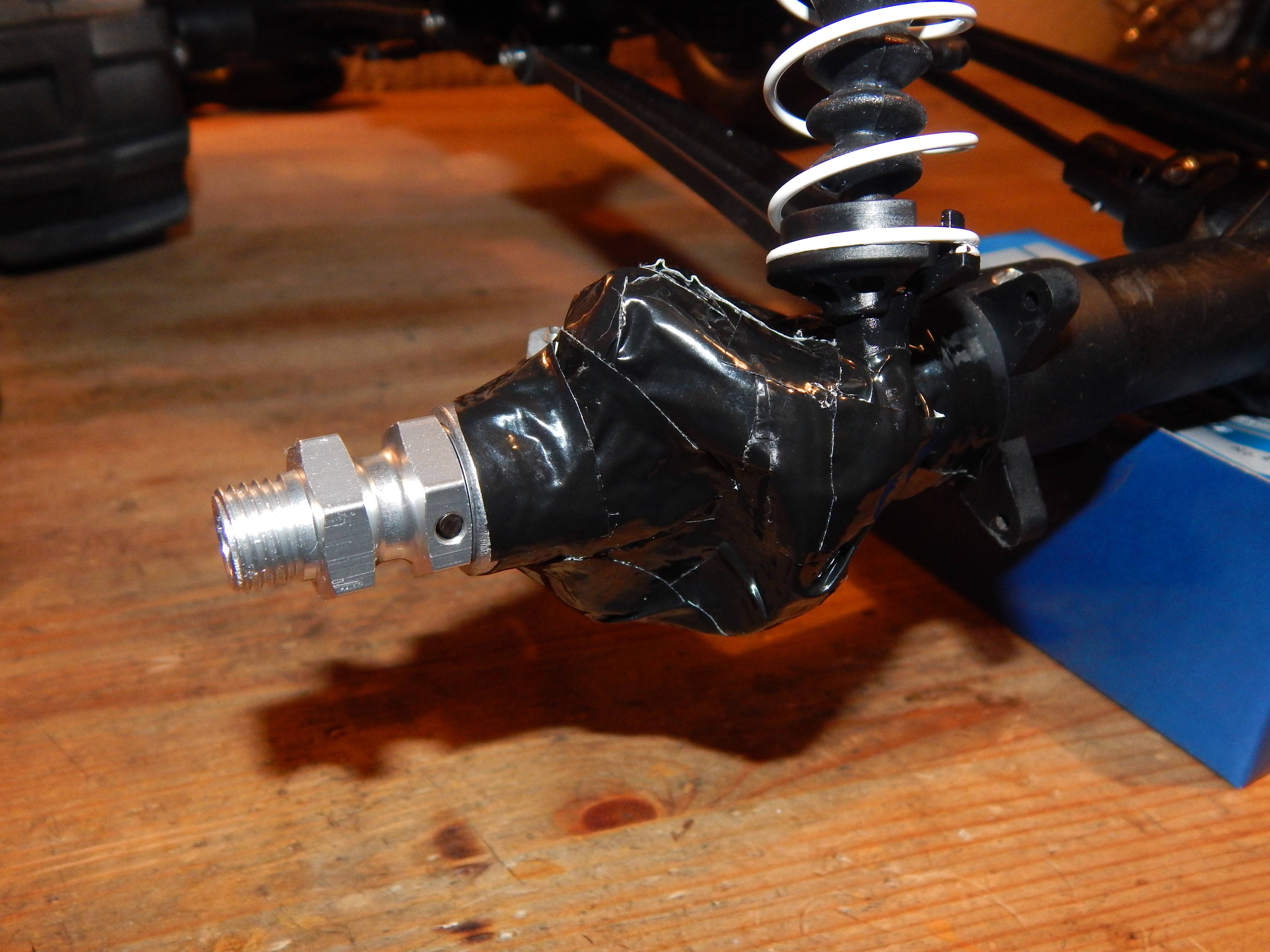 Als ich mit den Dämpfern fertig war, wollte ich noch ein anderes Problem beheben. Und zwar kommen immer Wasser und Sand in die Achsgehäuse, da bei den Radträgern eine Öffnung ist. Vorne ist das nötig, um zu lenken, aber hinten kann ich mich drum kümmern.