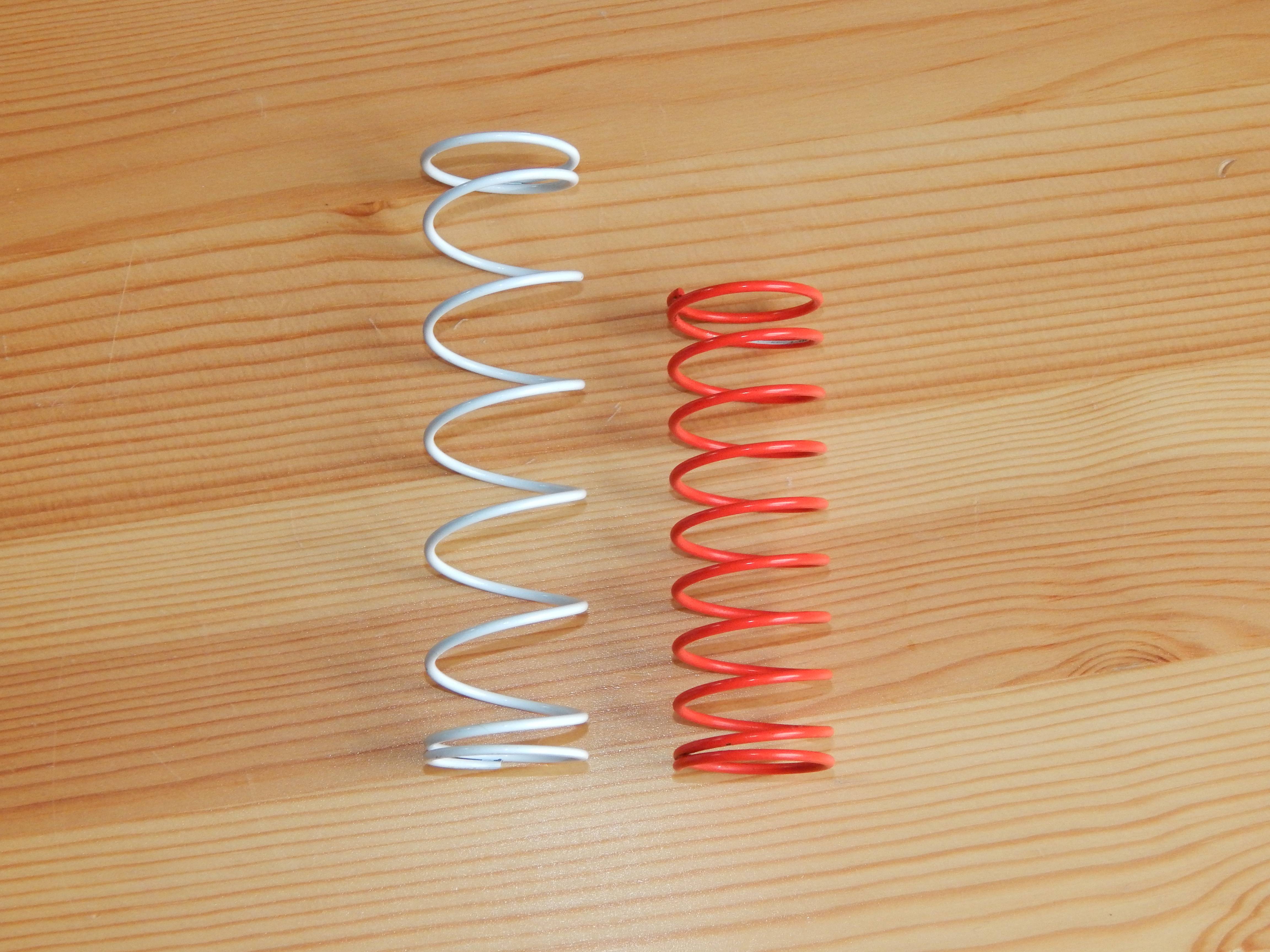 Hier mal die neue weiße und die alte rote Feder im Vergleich. Die weiße von den Aludämpfern ist deutlich härter.