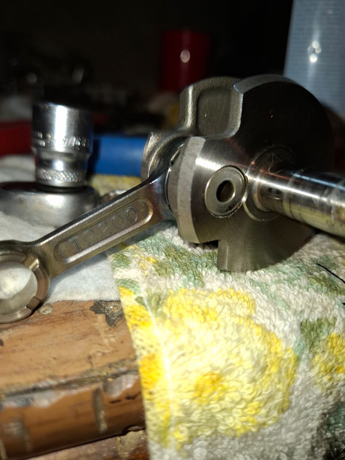 In der Zwischenzeit habe ich dann auch mal den Kolbenbolzen angeschaut, ich will mich jetzt nicht zu äußern:wand:, aber das ist dass zweite was so ausschaut, Blau Golden verfärbt, und da war es mir eigentlich fast schon klar, das er zu mager lief, aber der Kolbenboden sprach eine andere Sprache, der war schwarz, was wieder für eine Fettere Einstellung sprechen sollte.