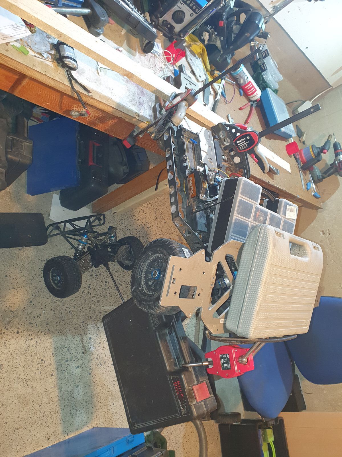 und viel gewicht und etwas Kraft versuchte ich die Platte langsam wieder in ihre richtige Richtung zu biegen. Auch musste ich mit einer alten Chassisplatte wo ich noch ein Stück über hatte und langer Schraube nachhelfen, ich sags euch, eine Geburt geht einfacher und schneller