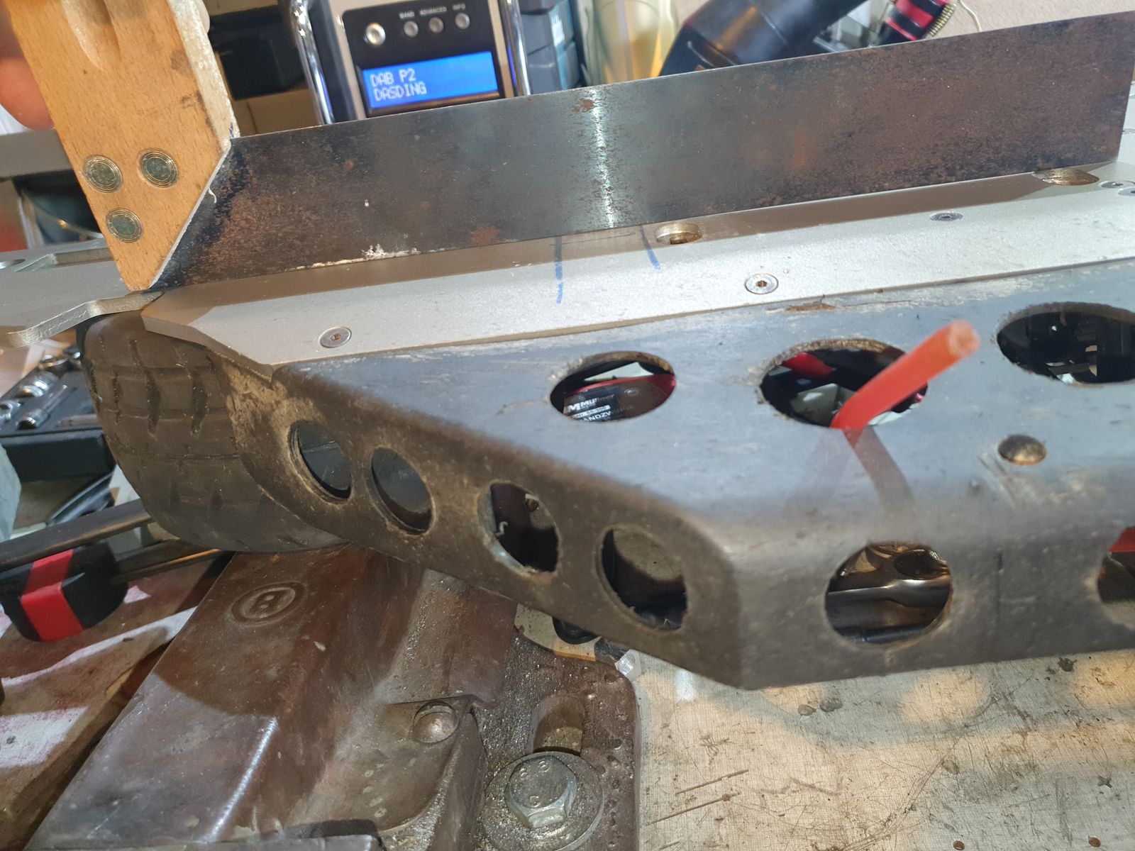 Nach dem die Platte endlich ihre grobe Form erreicht hatte musste ich noch die Vorderachse und die Radioplatte entfernen, damit ich diese vollens ausrichten konnte.