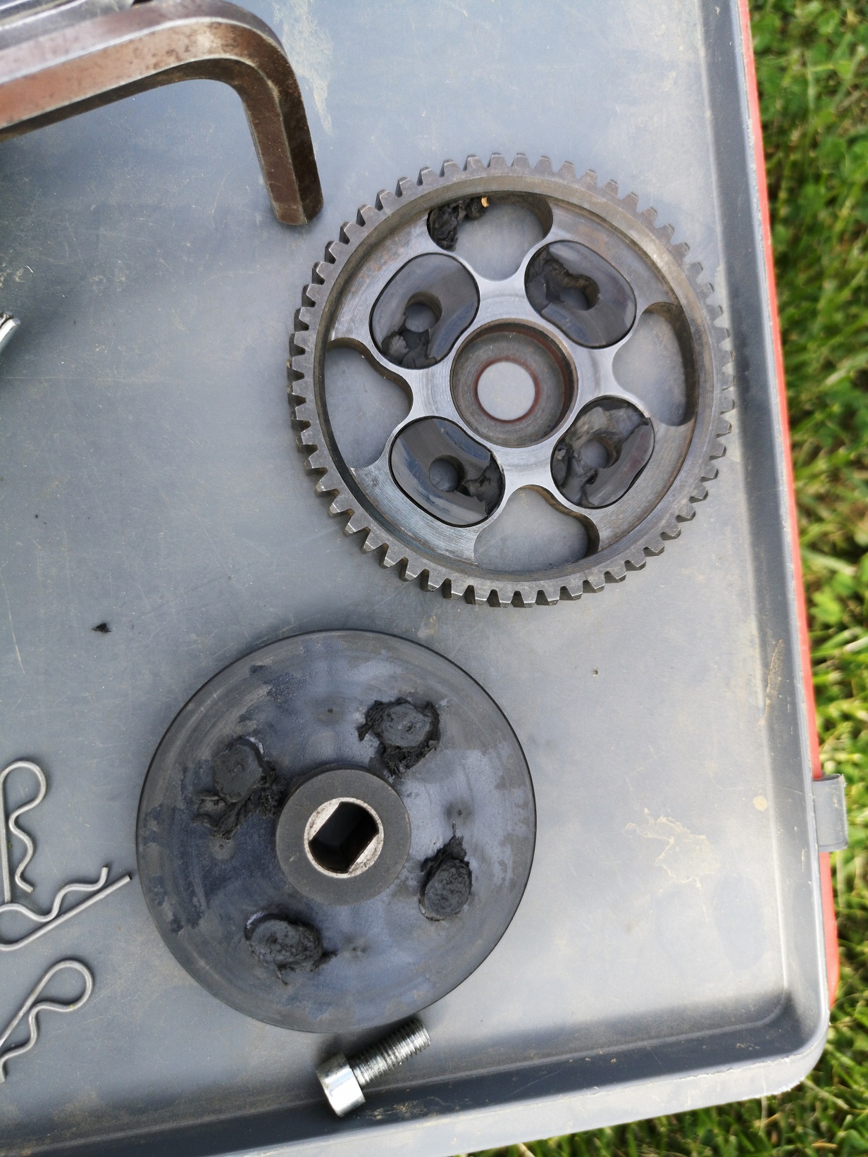 Also da ich ja eh nur Pech mit der Kiste hab, ist es jetzt nur noch das Hauptzahnrad. Das Pinproblem an den Antriebswellen hab ich auch gelöst in dem ich längere Pins verwendet hab und diese mitm Dremel eingekerbt hab sodass diese nicht mehr rausrutschen.
