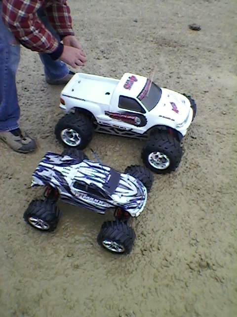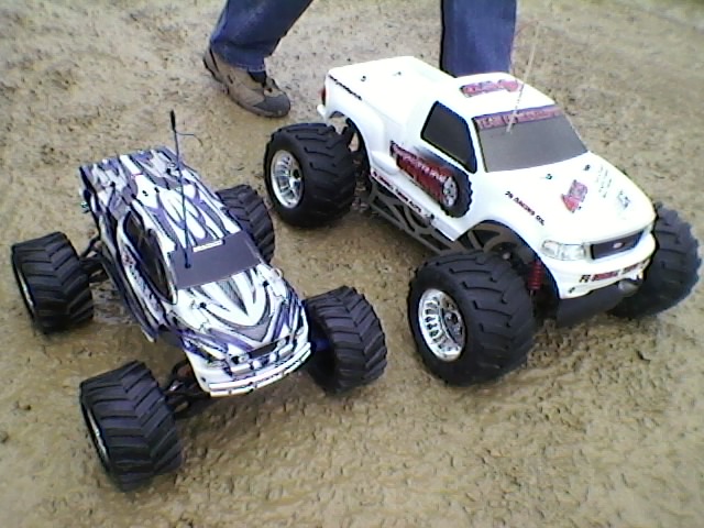 Hab mal 2 Bilder vom e-maxx und dem FG vom Kumpel gemacht.Waren da grad in der Sandgrube.Mein Kumpel hat da mal wieder sein Hauptzahnrad gefetzt und ich meine Dämpferbrücke wie ich schon geschrieben habe...