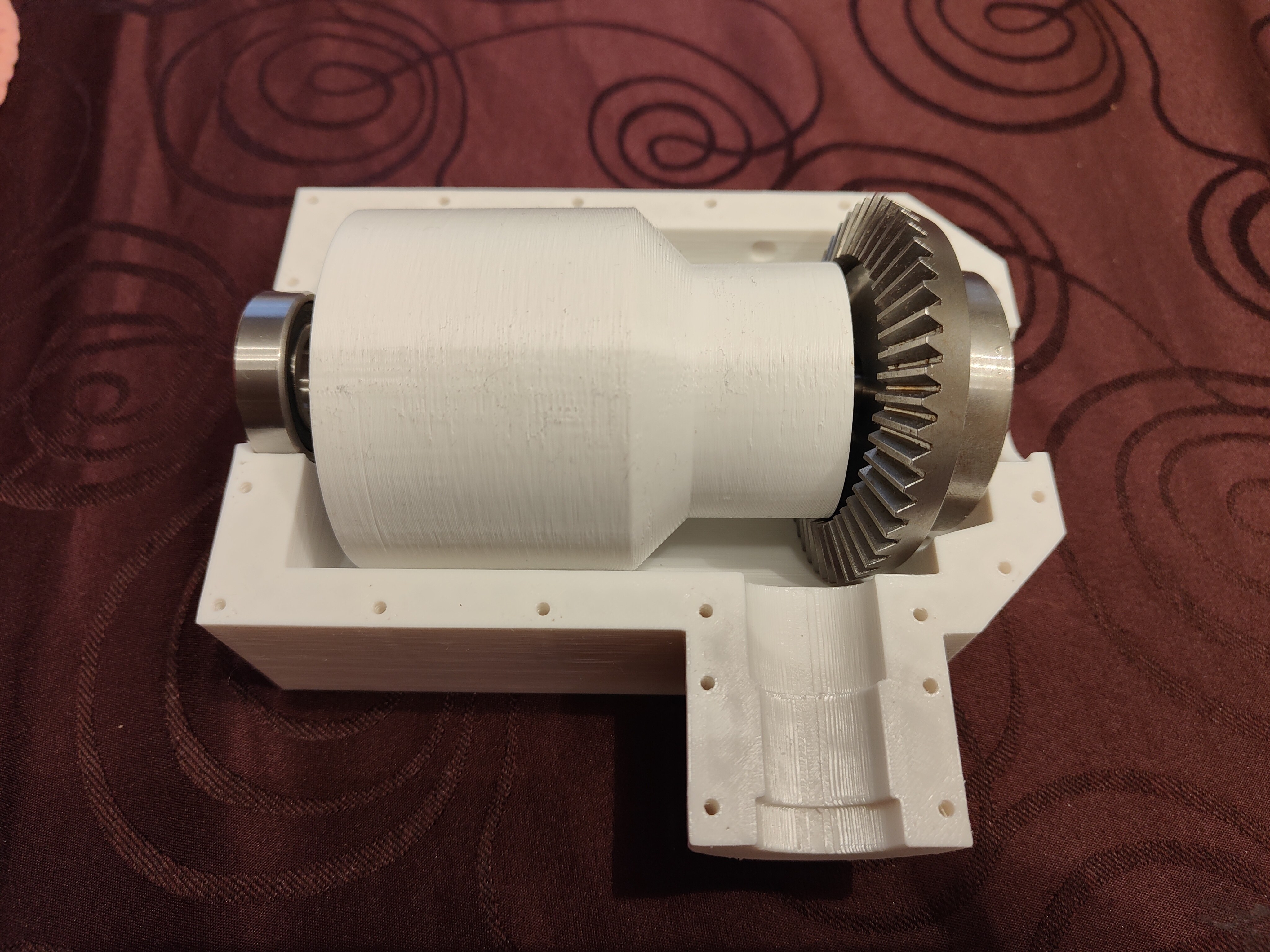 In der Zwischenzeit habe ich schon mal am Hinterachsgetriebe gearbeitet. Die Differentialglocke ist bereits fertig und auch schon mit allen Kegelrädern bestückt - das passte wie Popo auf Eimer, war ich selbst erstaunt. Die Spyder-Querachse ist zwar in einer Kunststoffnut in der Glocke aufgehangen. Sollte sich die Rundachse tatsächlich in den Kunststoff einarbeiten, wird mit Aluminiumstreifen nachgebessert. Aber davon gehe ich erstmal nicht aus.
