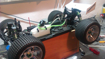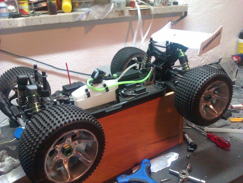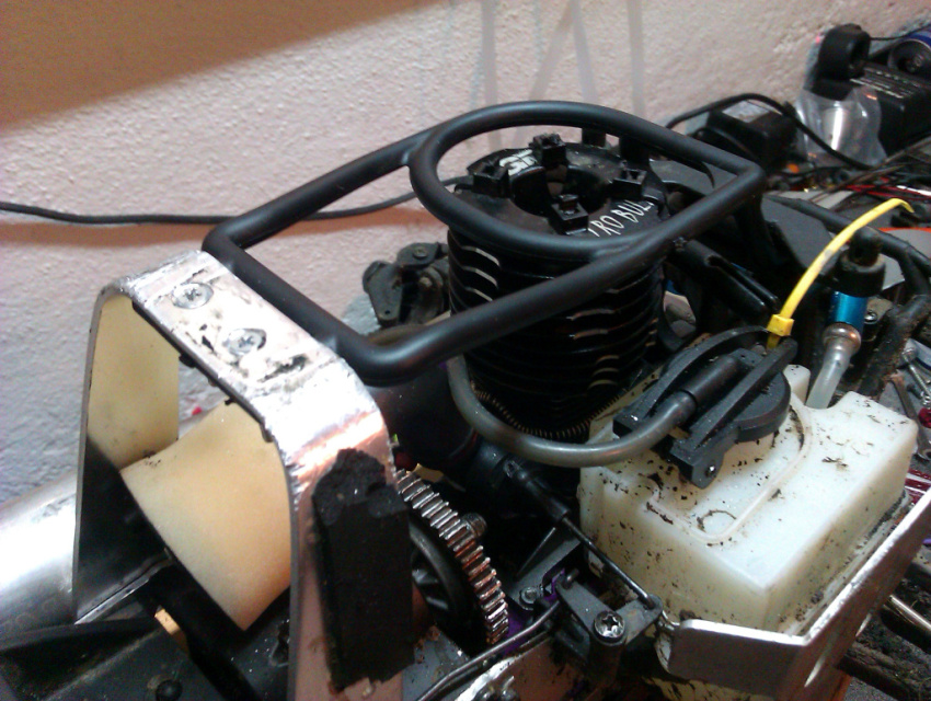 Angetrieben wird er von einem fast neuen GM Nitro Bull 28 der grade erst 20 Tankfüllen (inkl. Einlaufphase) durch hat. Zudem habe ich im Winter einen Neuen RD Logics Doppelrohr- Reso verbaut, geile Optig, genialer Sound(echt laut).