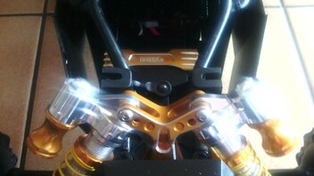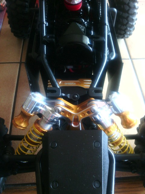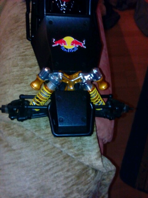 Es is einiges drann gemacht habe die analogen teile wie funke und empfänger durch ein 2,4 ghz system von ansmann ersetzt eine w5 um genau zu sein der standart brushed motor und regler wurden durch ein orion neon brushless set getauscht dämpfer vorne und hinten wurden getauscht durch goldene alu dämpfer mit gewinde und ausgleichs behälter dämpfer brücken wurden eben so getauscht durch welche aus goldenen alu und der servo halter auch die reifen wurden durch grobstollige ersetzt mit verschraubter felge und es wurden plastik netze rundum angebracht zum schutz der elektronik gemacht werden nu noch die standart reifen mit goldenen felgen ringen so wie eine gelbe caro und ein deutlich besseres servo und ein ritzel aus stahl so das wars erst mal