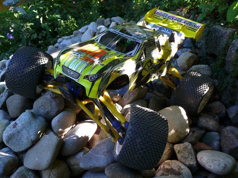 Die Rocker (Umlenkhebel) sind aus Alu von RD Logics. Die Dämpfer haben GTR beschichtete Gehäuse und vorne orange und hinten grüne federn. Sie sind mit 50er Öl befüllt, das ist mit den Federn nicht zu straff, aber auch nicht sehr weich.